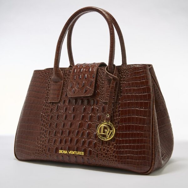 Turn heads with this bold and sophisticated handbag, crafted from genuine cow leather featuring an embossed crocodile pattern. The deep dark brown hue pairs effortlessly with gleaming gold-tone metal accents, creating a look that’s both classic and striking.